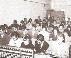 [[Imagem:Abaco17.JPG|thumb|center|250px|1º Concurso de Soroban no Brasil – 1958 (Homenagem aos 50 anos da Imigração Japonesa, realizado no auditório do Jornal Paulista) ]] | |||