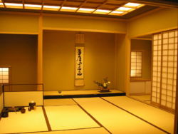 [[Image:Cha2.jpg|250px|frame|center|Visão interior de uma típica sala de Cerimônia do Chá, com ''tatami'', e ''tokonoma'' com arranjos de flores]]