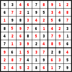 O enigma é então completado designando-se um número inteiro entre 1 e 9 para cada interpolação, de tal maneira que os vértices que são unidos através de uma borda não tenham nenhum número inteiro igual designado neles. Uma grade de solução válida para o Sudoku é também um quadrado latino. Há significativamente menos soluções de grades de Sudoku válidas do que os quadrados latinos, porque o Sudoku impõe restrições de região adicionais. Apesar disso, o número de solução de Sudoku para uma grade padrão de 9×9 foram calculados em 2005 por Bertram Felgenhauer como sendo 6.670.903.752.021.072.936.960.<ref>http://www.afjarvis.staff.shef.ac.uk/sudoku/</ref> Este número é igual a <math>9! \times 72^2 \times 2^7 \times 27.704.267.971</math>, o último fator o qual é um número primo. O resultado é derivado através da lógica e computação força bruta. A derivação deste resultado foi simplificada consideravelmente por análises fornecidas por Frazer Jarvis e o número foi confirmado independentemente por Ed Russell. Russel e Jarvis também demonstraram de que quando as simetrias são levadas em conta, havia 5.472.730.538 soluções.<ref>http://www.afjarvis.staff.shef.ac.uk/sudoku/sudgroup.html</ref> O número de soluções válidas para a variação do Sudoku de uma grade 16×16 é desconhecido.