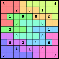 Uma dimensão também utilizada é com os dígitos com as mesmas posições relativas em suas respectivas regiões; porém as regiões não formam um paralelogramo e possuem formatos variados e desconexos, neste formato Conceptis Puzzles apresenta o Irregular Sudoku,<ref>http://www.conceptispuzzles.com/products/sudoku/irregularsudoku.htm</ref> enquanto que algumas editoras também se utilizam de cores diferentes em cada grupo desconexo para uma melhor identificação de cada grupo de números.